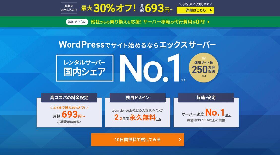 エックスサーバーなら簡単にWordPressがインストールでき、契約している限り独自ドメイン無料でブログ運営を始めることができます。